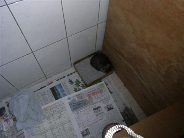飛奔到孟如家後,緊張地打開房門,哇哇哇! 不鏽鋼小碟空了! (另外放乾糧的那碗還是滿滿的) 又一次感動到想哭! 不過,看到小貓窩在鐵盒上安穩地睡著……咦? 那是貓沙啊! 牠幹嘛睡到貓沙上去? 仔細一看,原來牠把其他地方都尿溼了,只剩貓沙那塊是乾的。